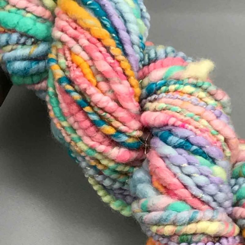 太さは並太〜極太で所々にキラキラ光るファイバーを混ぜてあります。