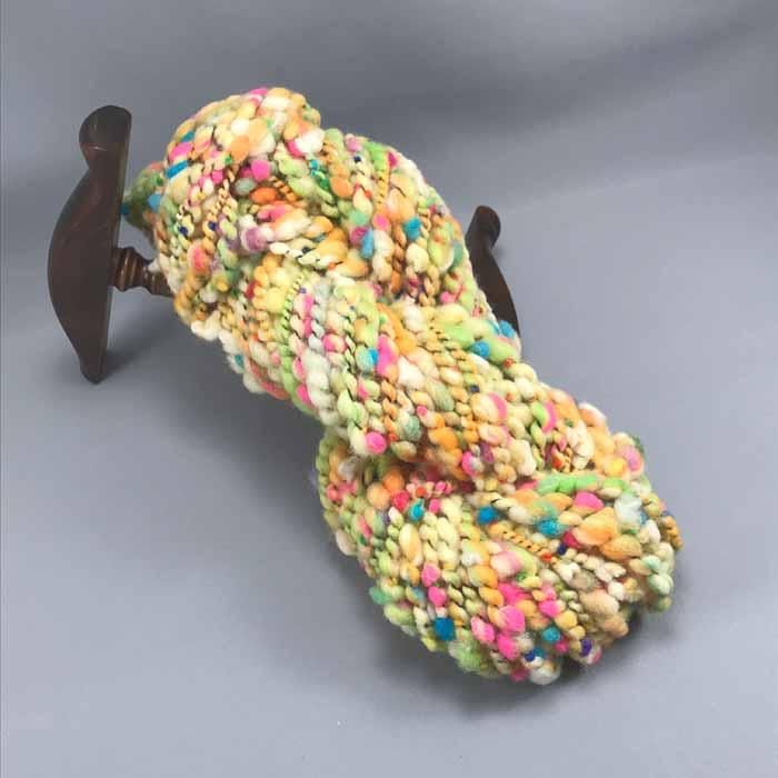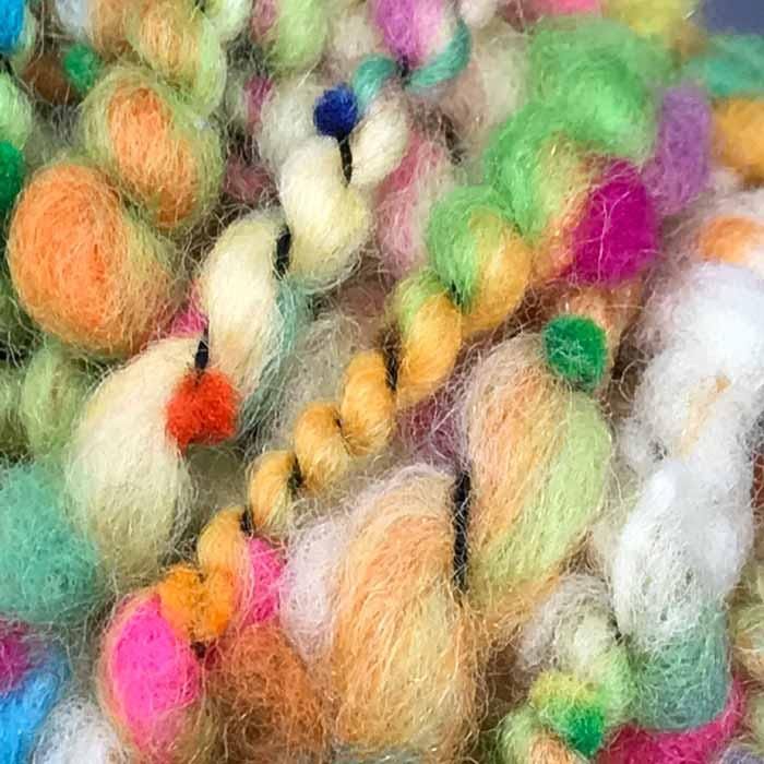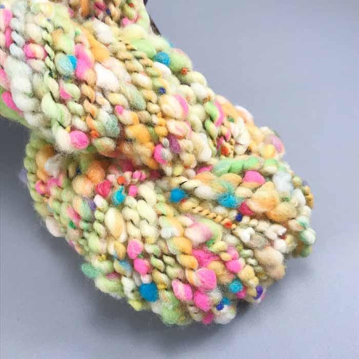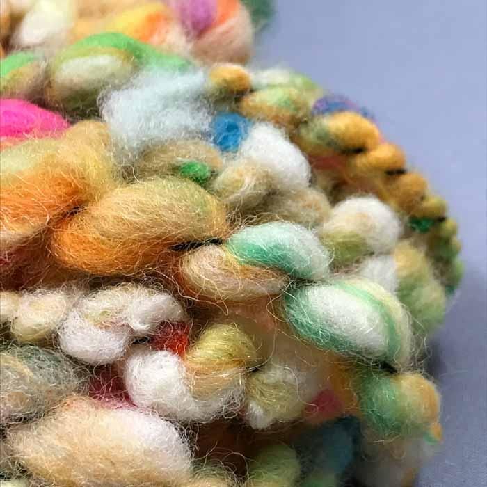 イエローベースのミックスウールに沢山のネップとすこしのファイバー等を入れて紡ぎました。