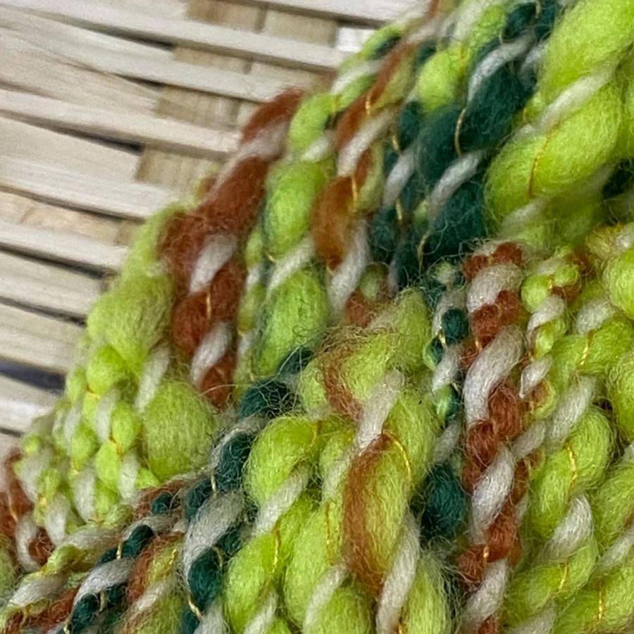 森の中から拾い上げてきた色たちが詰まったアートヤーンだなと思いました。森の物語や、森に差し込む日差し、小川のせせらぎ 鳥の声 そんな朝を連想させる美しい手紡ぎ糸です。