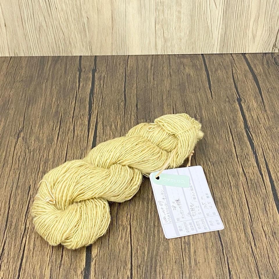 庭に生えているキンカンの枝葉で草木染めした手紡ぎ糸で、自然の風合い豊かな一カセです。