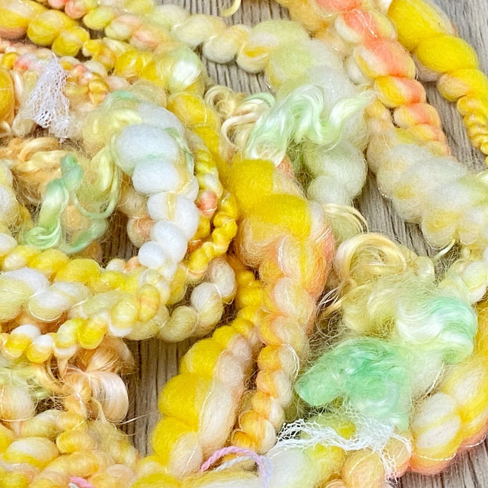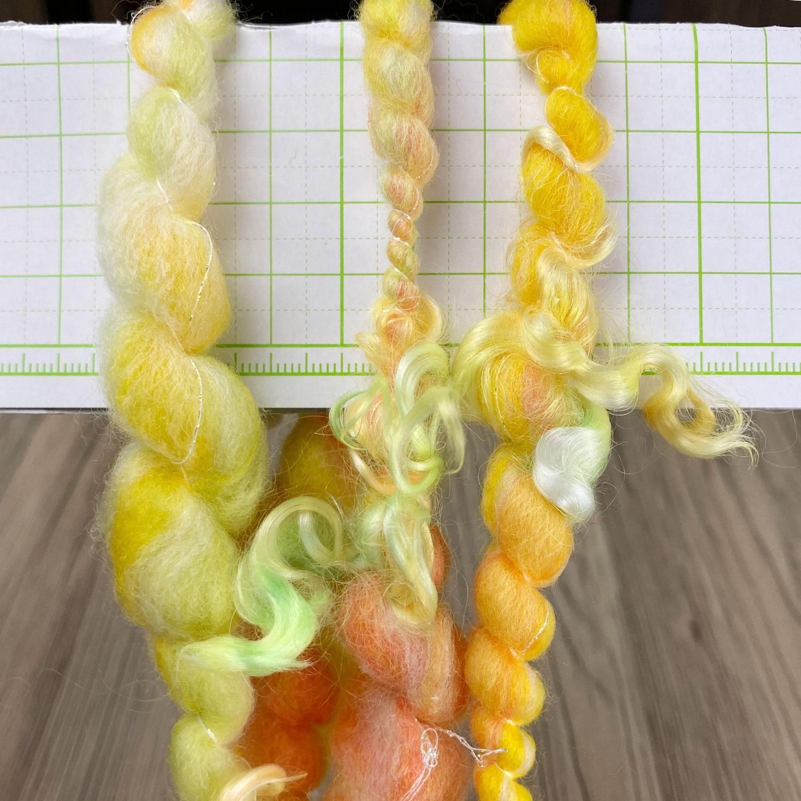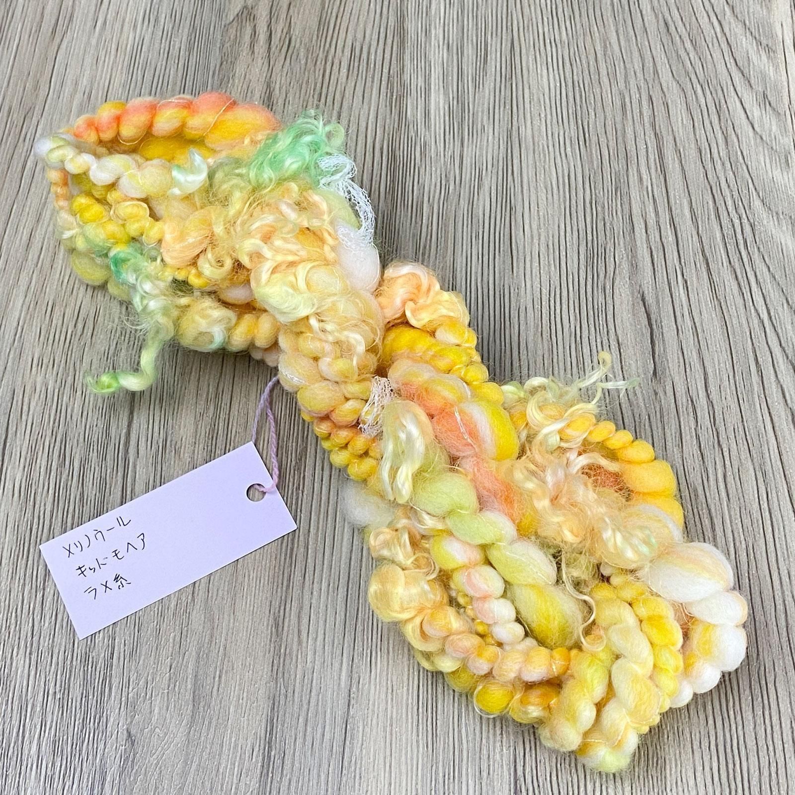 シトラスカラーに手染めしたキッドモヘアを巻き付けて紡いだスパイラルヤーンです。